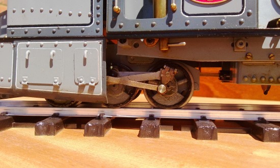 Only the coupling and connecting rods along with the reverse crank and eccentric rod are visible beyond the skirts. This obviated the need for cylinders and flexible steam connections to the bogies. There is also an exhaust water separator in the long exhaust steam pipe between the marine engine and the chimney.