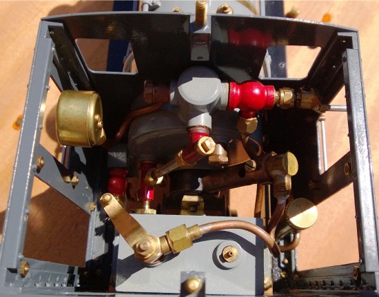 Works No. 119 was the second of Peter’s locomotives to use a ceramic gas burner mounted with the mixing tube just off the vertical. The centre flue boiler is 6.5in long and 2 ½“ diameter with a 28mm flue and having water tubes close to the burner end of the flue. With the boiler entering approximately one inch into the cab, followed by the burner, Peter found it necessary to increase the length of the cab in order to accommodate the vertical gas tank. Even so, there is not much room and small fingers are required to access the blow-off valve and water gauge blow down valve.