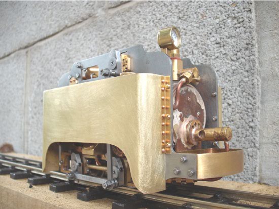 In April 2009 I bought a copy of Garden Rail while on holiday and found an article on a 7/8″ scale Spence Guinness Loco built by Peter Angus Locomotives. I just fell in love with it. There was no way I could, (1) afford it and (2) I wanted one in sixteen mill. So I started researching it on the internet where there is plenty of information but no drawings of any kind. Having discussed this with members of my local group. Edward Hodson said he would look through the library archives at the NGRS. He came up trumps with a drawing published in The Mechanical Engineer of 1888 and it was drawn 1/20 scale. So I set about drawing one using a twin cylinder double acting oscillating engine with a gear drive to the top jack shaft. After a lot of head scratching and hours going blind in front of the computer screen, enough was laid out to make a start. The foot wells and frames were made first along with the wheels and axles. Then the coupling rods and fly cranks. It was then taken to the club track and pushed round for a few hours to run the motion work in.