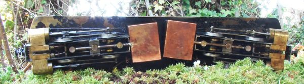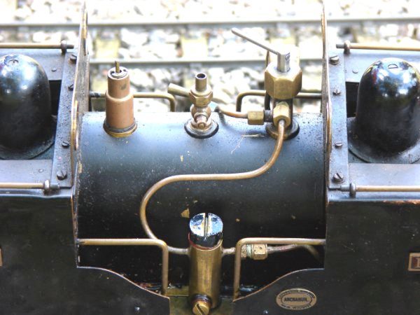 Make no mistake, this is a very important loco in the history of 16mm, because it significantly raised the bar for what could be built. It is a large and for the scale very heavy loco. It has a single boiler which holds a pint of water. There is a large meths tank on the trailing end of each bogie, and these feed six burners, a by product being that flare-ups can be spectacular! The boiler itself runs at very high pressure, the safety valve being set to blow off at 90psi.