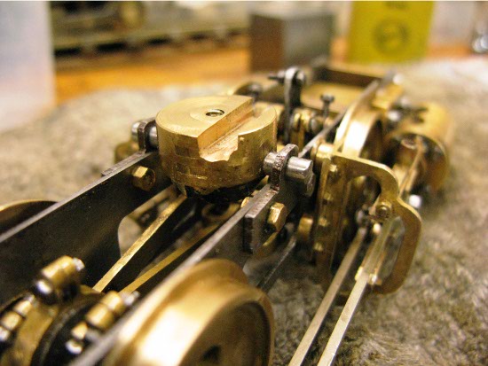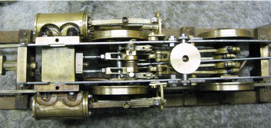 Here is the ‘Power Bogie’ completed. This is a tight fit for four eccentrics !! The main steam pipe runs on the inside of the frames and enters the steam chest at the front. A flexible coupling was added at the rear of the bogie. At this point the reach rod ran underneath the pivot. This did not work because the centre-mounted reach rod did not allow the bogie to swing.