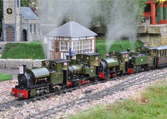 Steve Acton’s Talyllyn No’s 4, 6, 3 & 7 quad heading on the Ashfields Light Railway. Photo by Ian Shields.