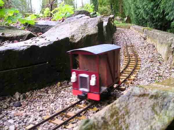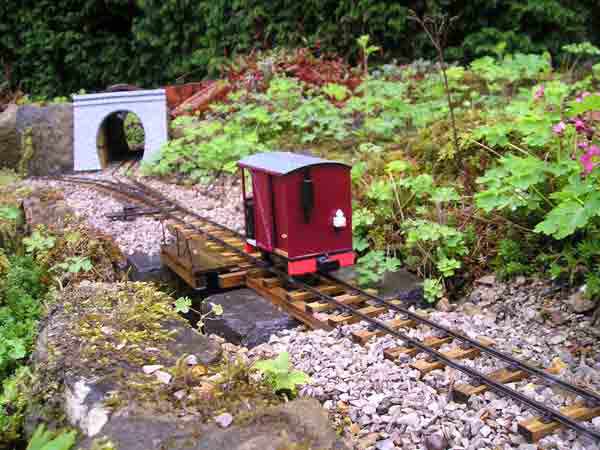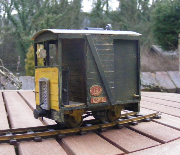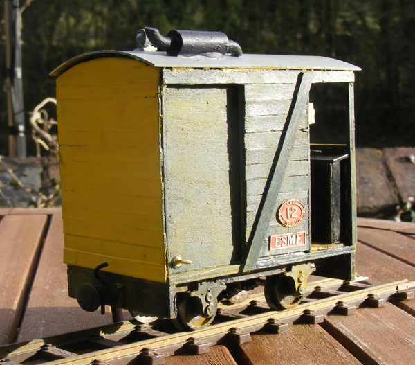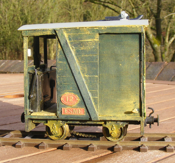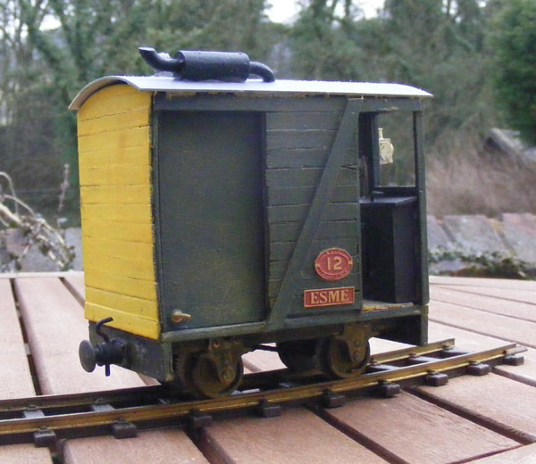 ESME was an IP Engineering “Lollypop Railcar” acquired at the 16mm Association’s AGM & Convention in April 2004. It is pictured here on 5th May 2004, complete with name and number plates, on the MDLR’s first working of the day – the “up explosives”. Note that this whole train was built in 2004 – the gunpowder van at the end of the train was on its first run.