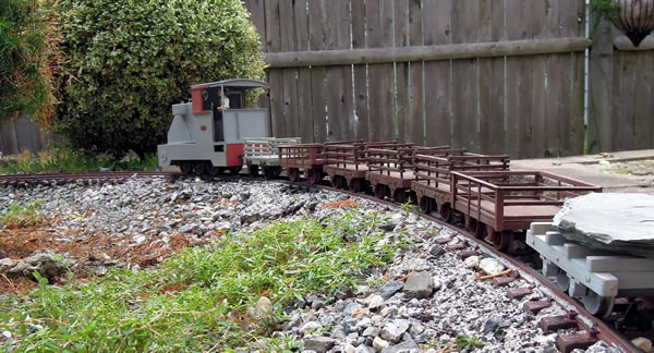 Scratch built Kerr Stuart pulling some empty slate wagons on the Middlesex Light Railway. The engine and many of the wagons were built by Don Jackson of Maine. Photo by Joe Lecesse.
