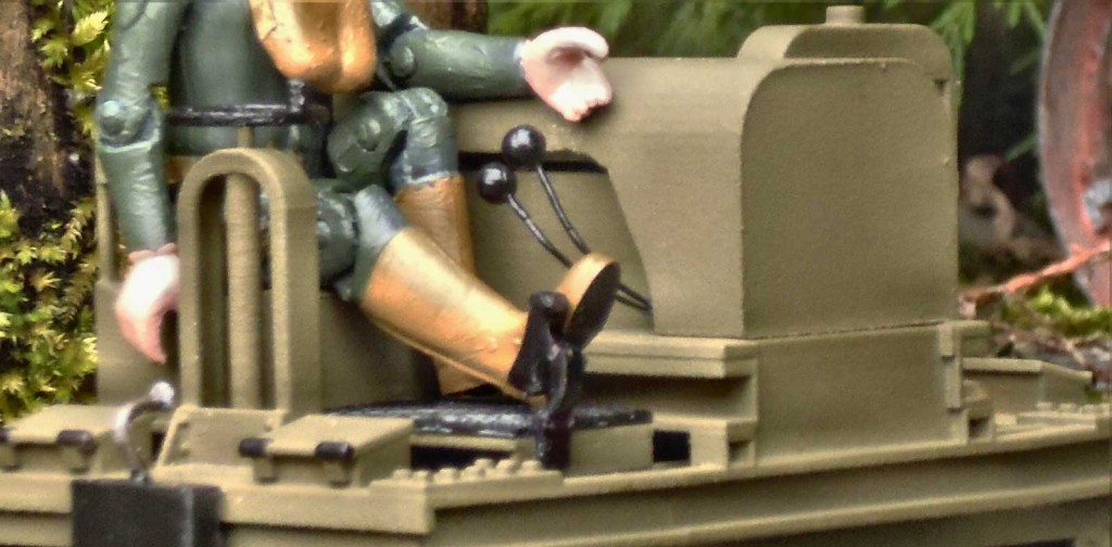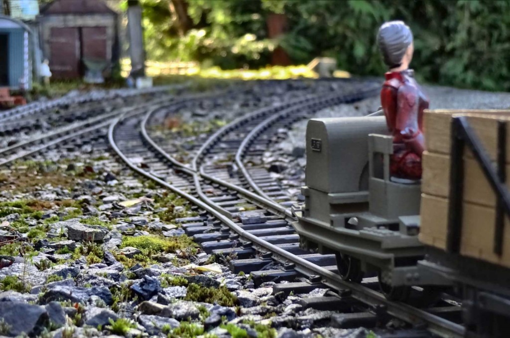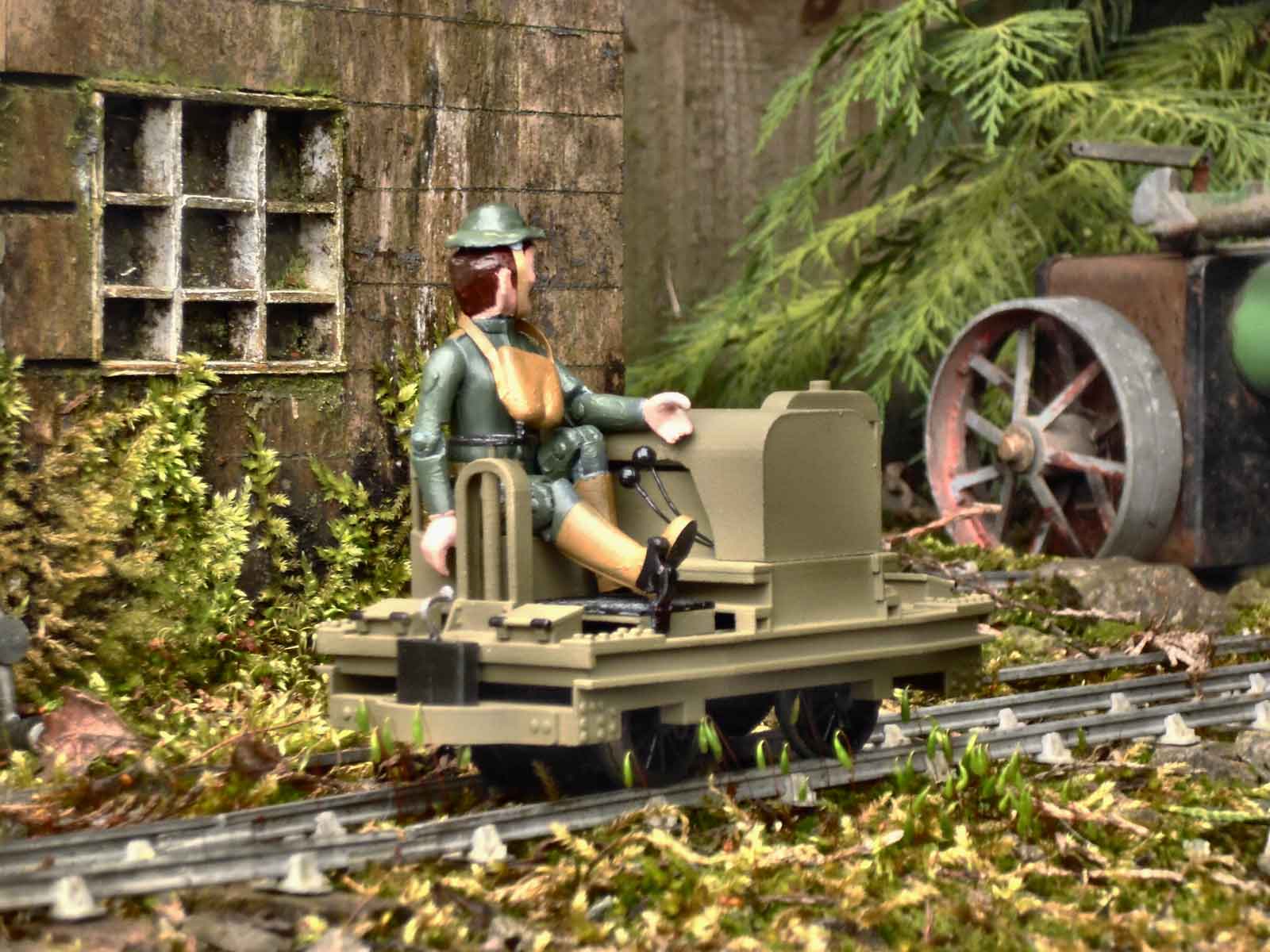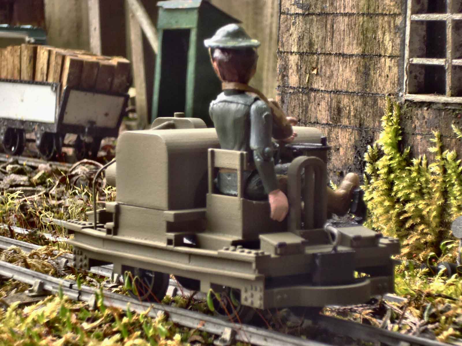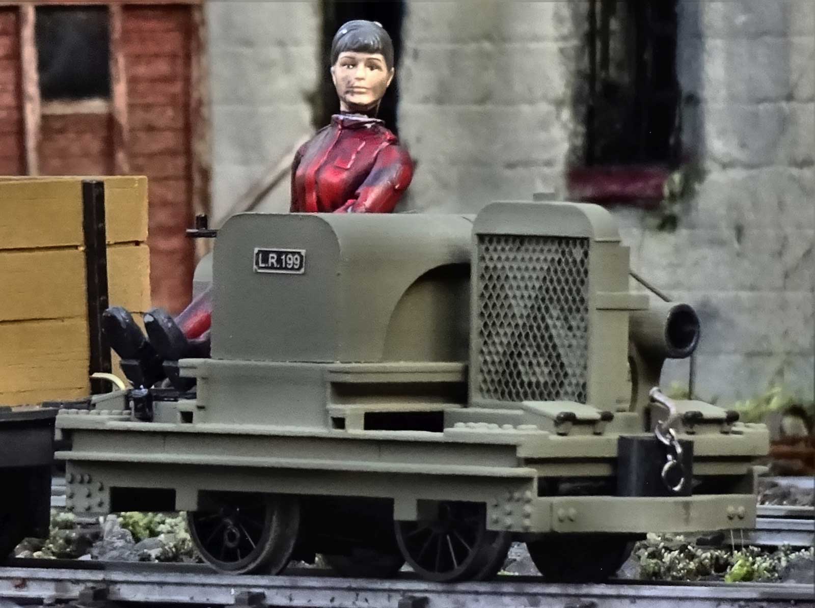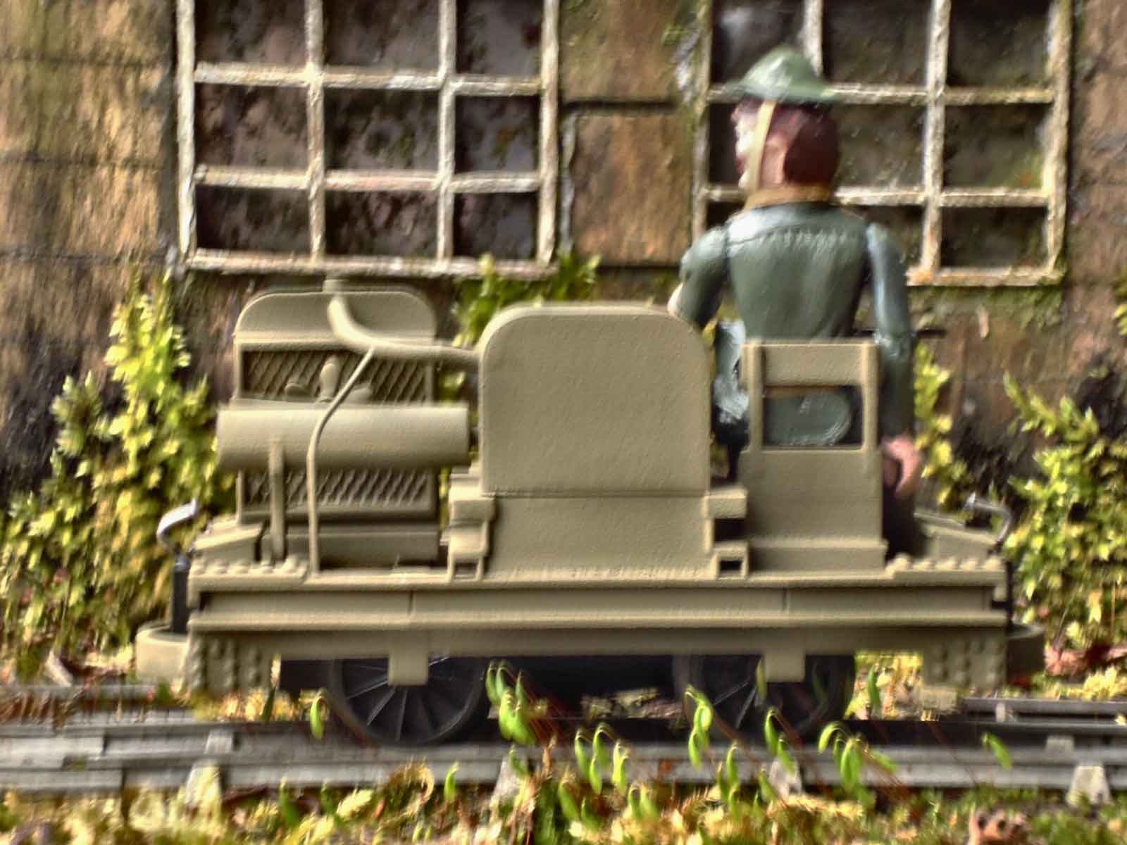 The 3.75” tall range of Space Precinct figures, which are out of production but widely and cheaply available second-hand, populate much of the railway. Modified with craft tools, ‘Jasper’ has been cut to fit the accurate but awkward low seat. Once posed in a happy position his legs and hips have been superglued, with only his arms and head left movable for direction changes. His helmet and gas mask holder are Blu-Tack, with straps made from a brown paper envelope.