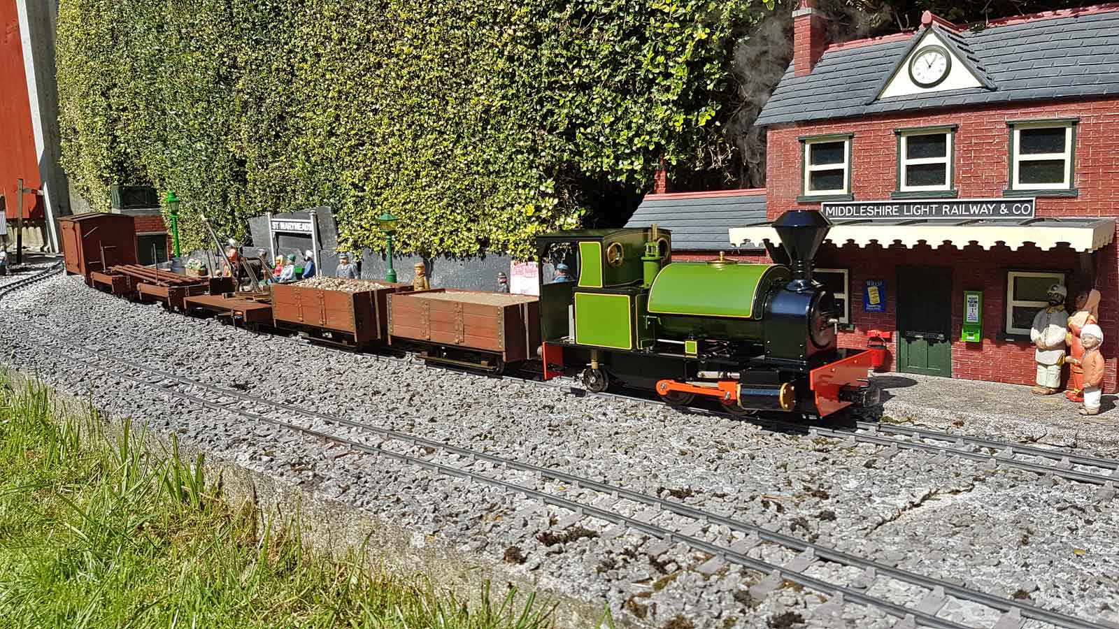 An Accucraft “Leader” with the permanent way train, passing though St Marymeads station on Richard Copperwheat’s Middleshire Light Railway. Photo: