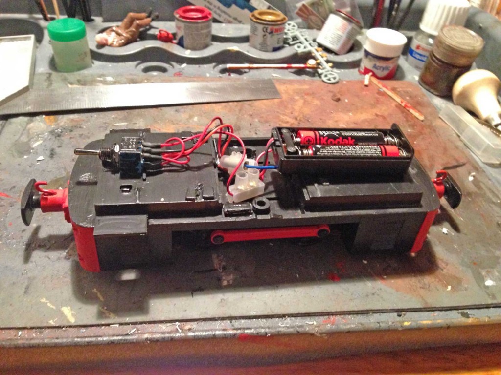 Now to the chassis – I’m not the greatest wiring/soldering person so I started by thinking I’d just paint the rods and we’d be OK. However, in view of how well the body was progressing, I decided to get stuck in and remove the Big Big battery & power switch set up and move to a solution that could be used easily as a manual operation but could easily be converted to RC down the line. So after lots of support and advice from my fellow Garden Rail Forum members, here are a couple of before and after pics to show what I did:-