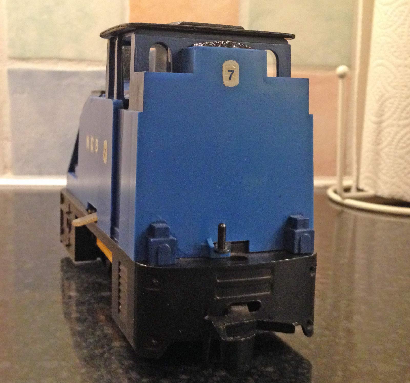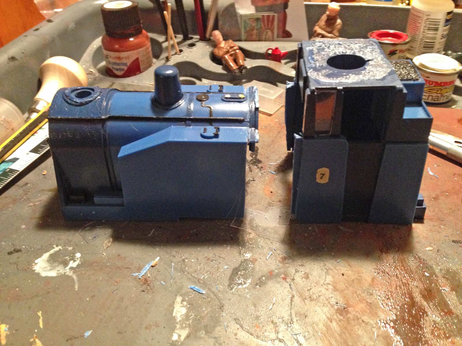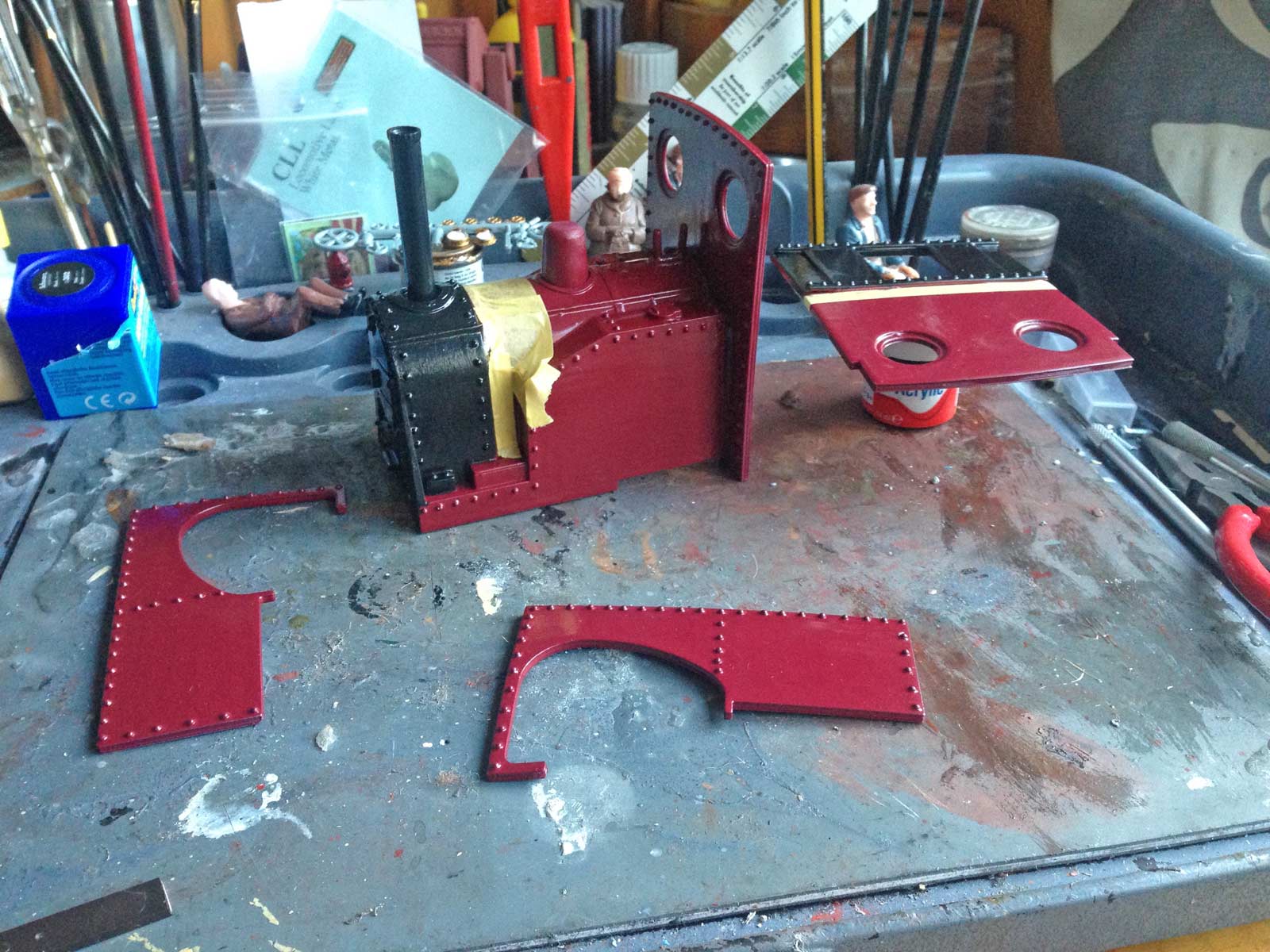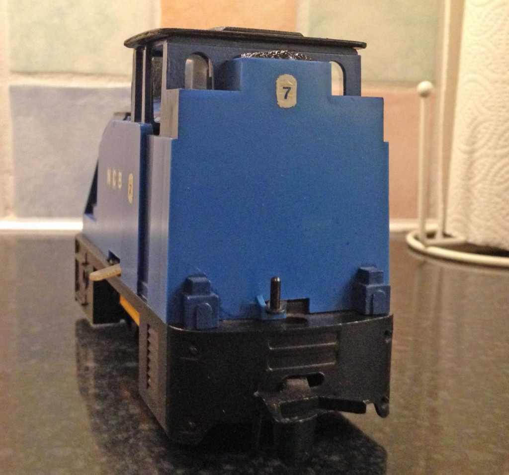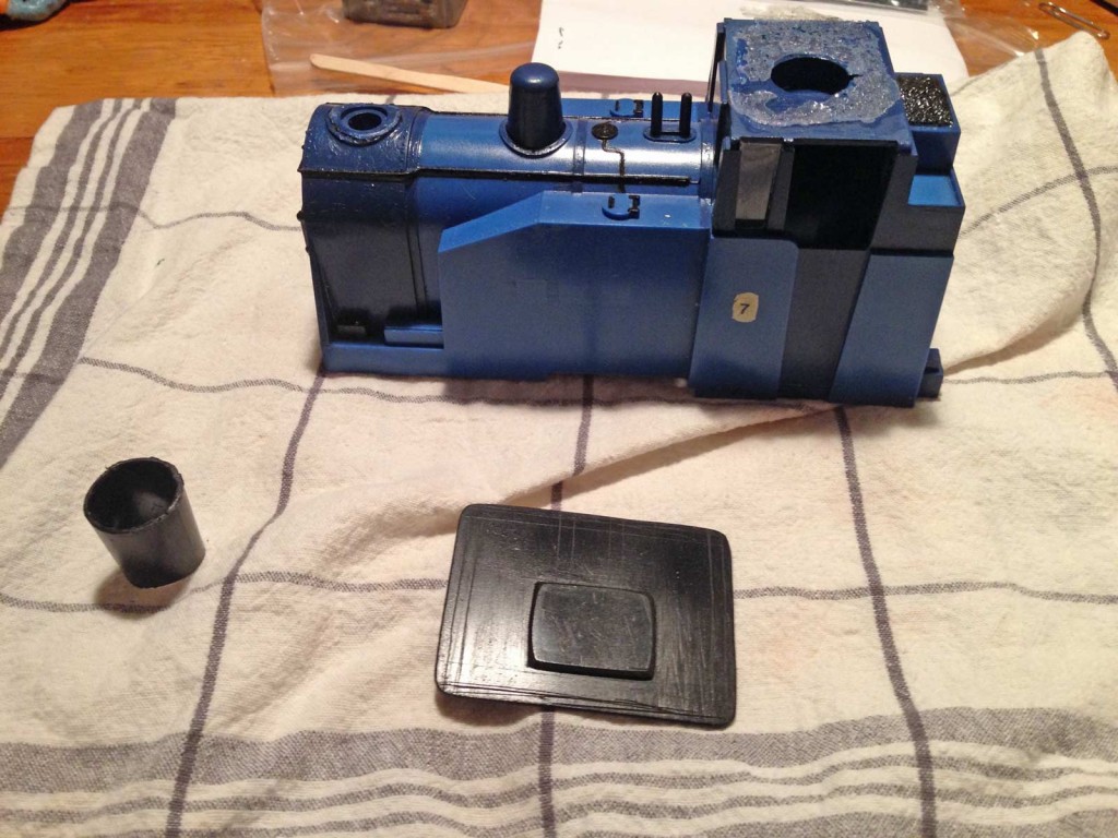 The loco was then painted up  – I decided to paint each section separately, as using gloss rattle cans, I find the flatter you can keep each piece, the better results you get. As this was winter time for the final coats, I had to get the shed (and rattle can) nice and warm to get the shine. Here we are part way through – note the new chimney which started life as a ball point pen!