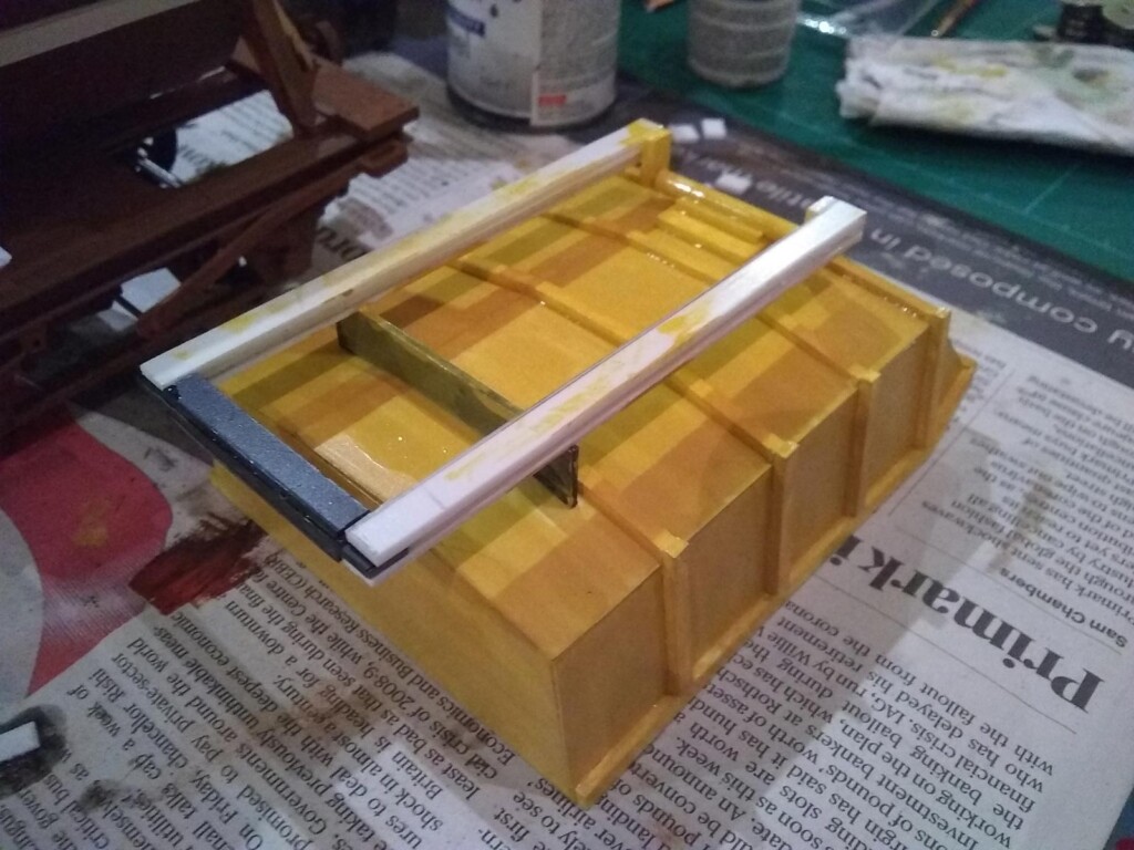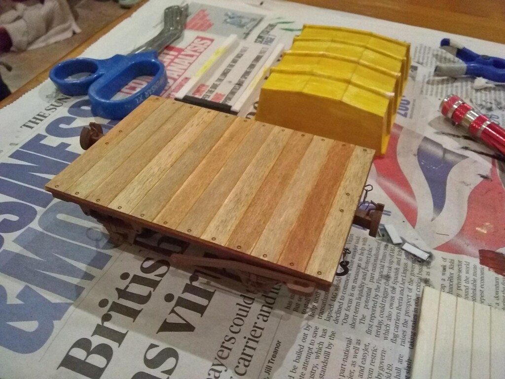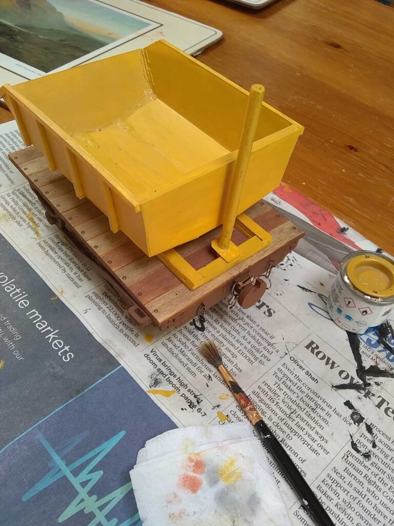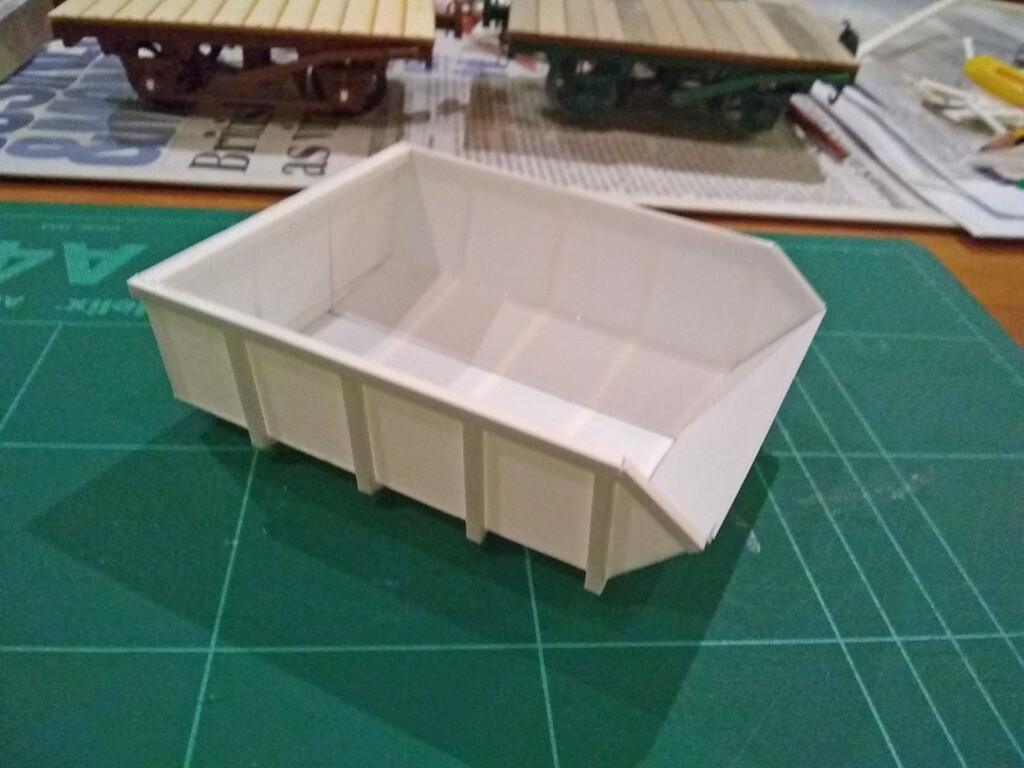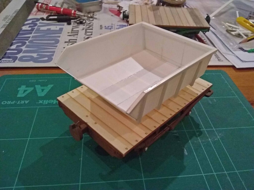 A card mock-up of the tipper bucket had been made in 2018, and so this was used as a rough template for the plasticard version, though reduced to a size that better fitted the wagon as per images of the prototype. (Thanks are due to Alan Mitchell, whose Zenfolio site has excellent pictures of the trackbed in the present day, and additionally has some colour pictures from the early 1970s of the stock shortly after closure.)