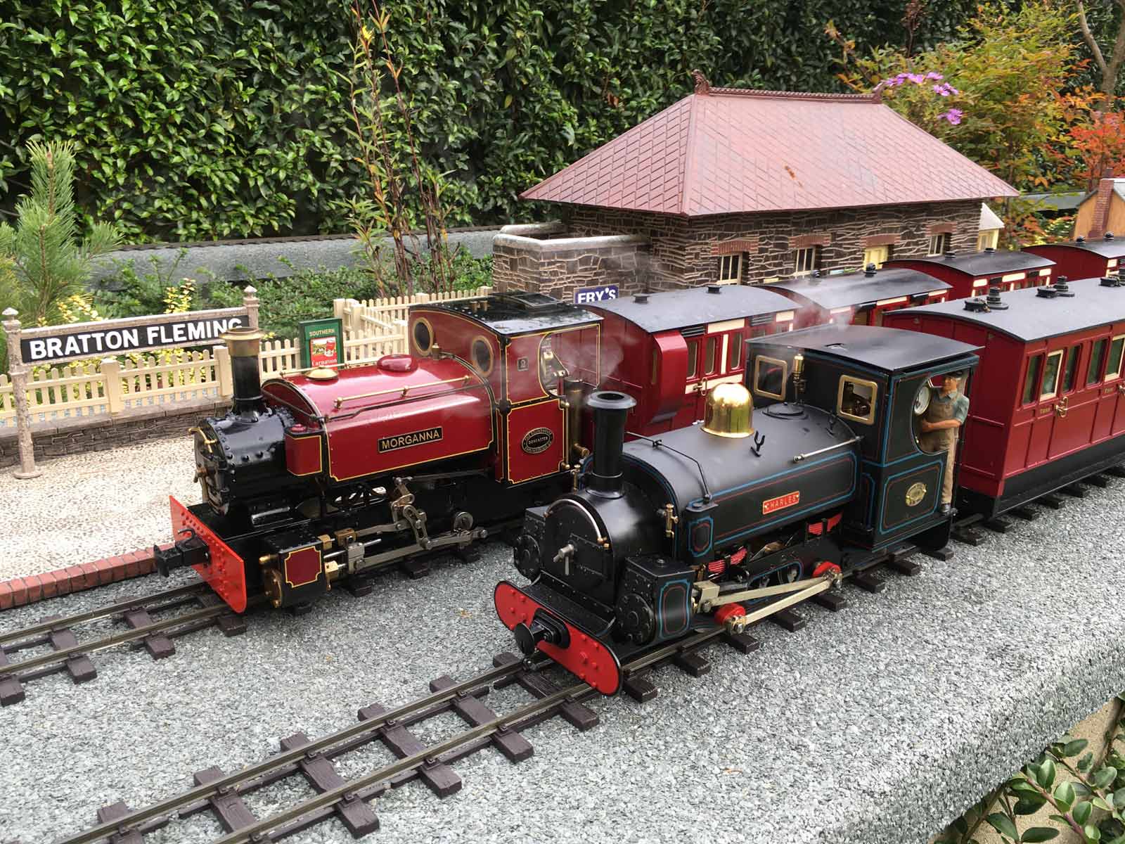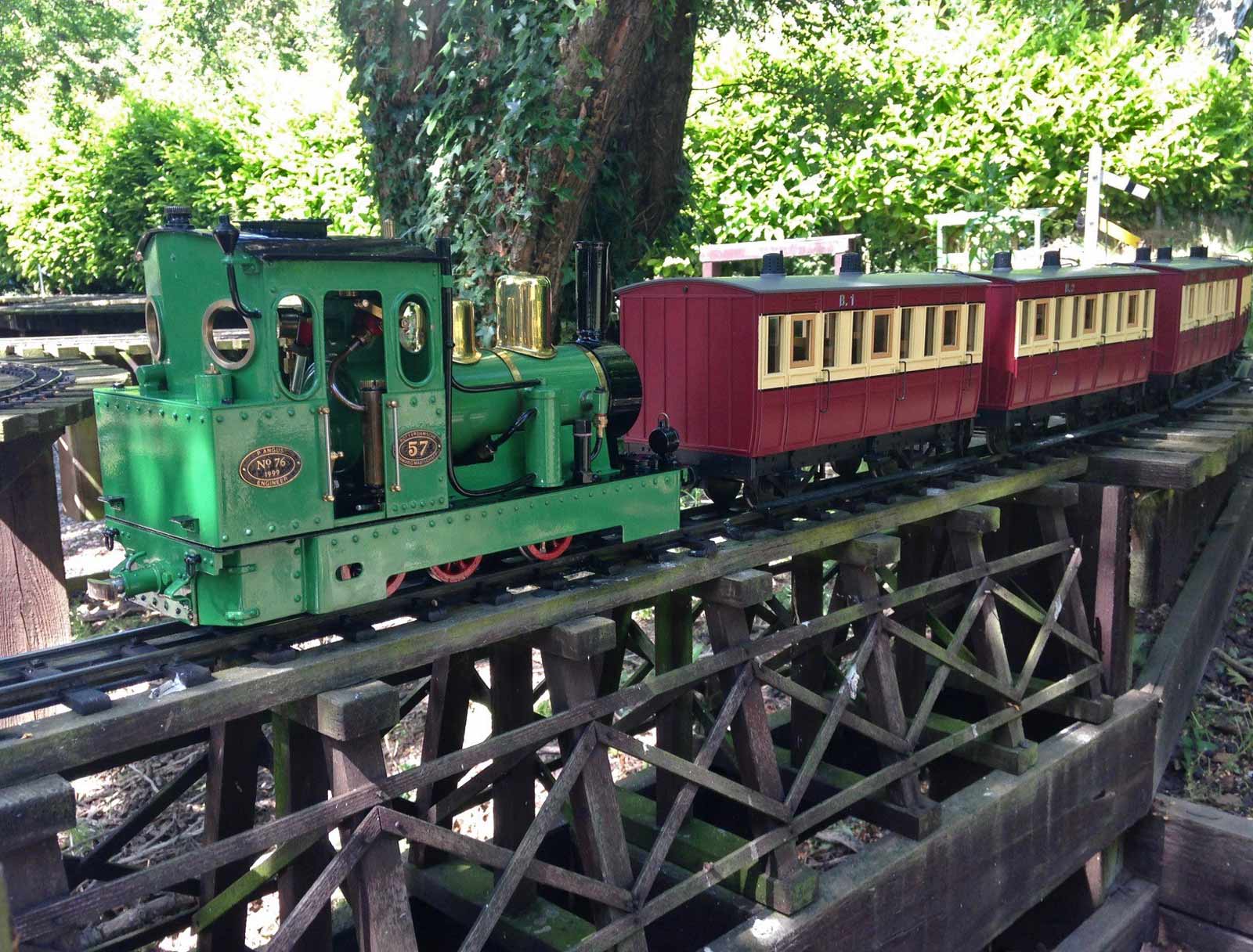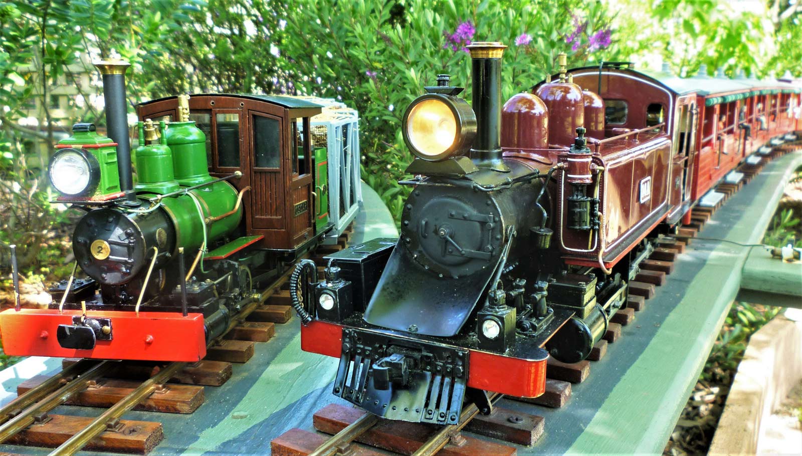 "OSCAR", a "Philadelphia" built by Gordon Watson's Argyle Loco Works, with a load of sugar cane bins, meets Victorian NA class No. 14A, pulling a rake of scratch built passenger cars. Photo: John Pearce.